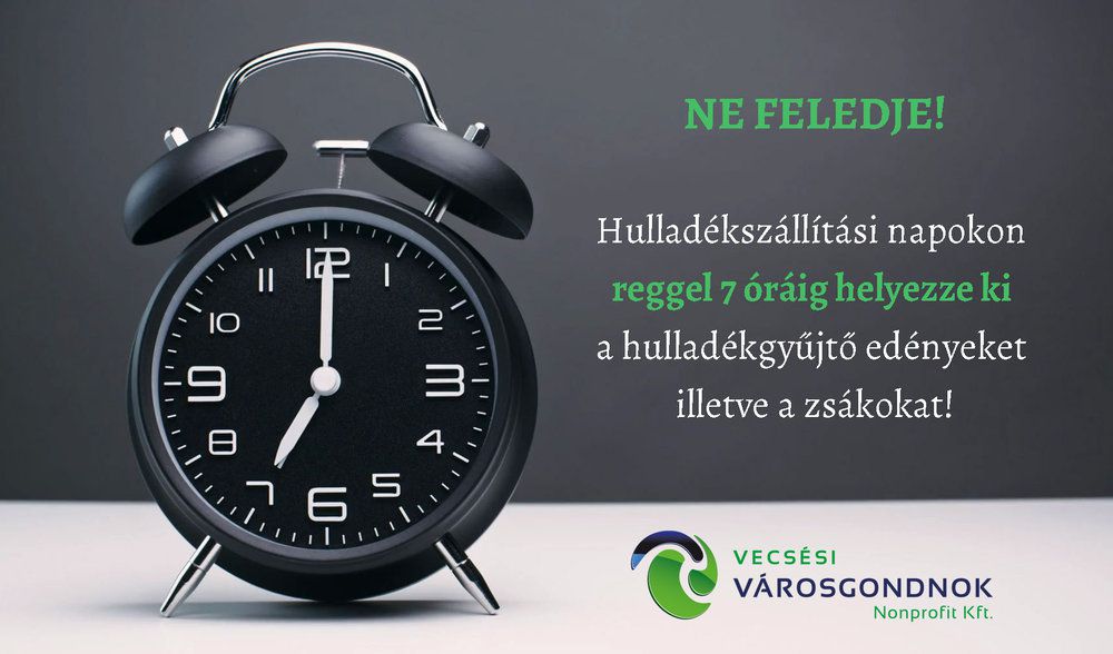 Kérjük vegyék figyelembe, hogy az utóbbi időben megnövekedett hulladékmennyiség miatt a hulladékszállítási napon nem biztos, hogy Önök által megszokott időpontban megy a járat, ezért szükséges reggel 7 órára kihelyezni az edényzetet.